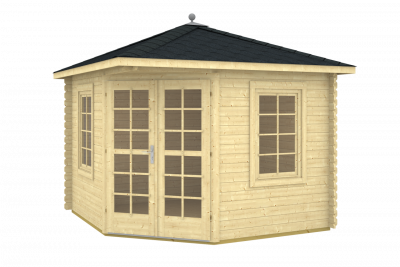 Die auch Zeltdach genannte Bauform wird sehr gern auf einem 5-Eck-Gartenhaus verbaut, was zusammen einen interessanten Anblick im Garten bietet. Im Vergleich zu den gängigen Sattel- und Pultdächern bringt Ihnen diese Dachform etwas Romantik und Leichtigkeit in den Garten. In der Regel wird das Spitzdach auf einer viereckigen Grundform verbaut. Aber auch fünfeckige bis hin zu achteckige Gartenhausformen können mit diesem Zeltdach gebaut werden. Als „Kirsche auf der Sahnehaube“ bietet der Handel Dachhauben mit oder ohne Zierkugel an, die auf dem sogenannten „Firstpunkt“ auf der Dachmitte angebracht werden können. Ein beliebtes Produkt ist unser 5-Eck-Gartenhaus Norwegen 26.